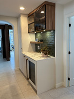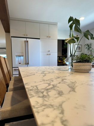 Ce projet de rénovation résidentiel met en valeur un agencement harmonieux des textures et des matériaux. La combinaison de céramiques soigneusement sélectionnées, de bois chaleureux et d’un comptoir au fini marbré crée un espace à la fois élégant, intemporel et accueillant.